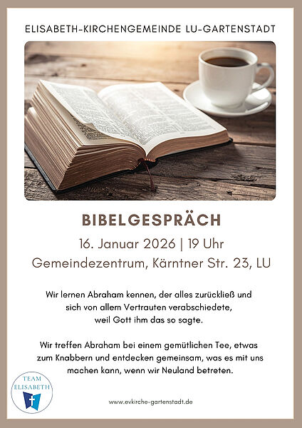 Kennen Sie schon Abraham? Nein? Wenn Sie zu unserem Bibelgespräch am 16. Januar um 19 Uhr ins Gemeindezentrum kommen, dann können Sie ihn kennenlernen. Er ist ein ganz interessanter Mann und wird uns berichten von seinen Erlebnissen, als er alles zurückließ und sich von allem Altvertrauten verabschiedete, und das nur, weil Gott ihm das so sagte.